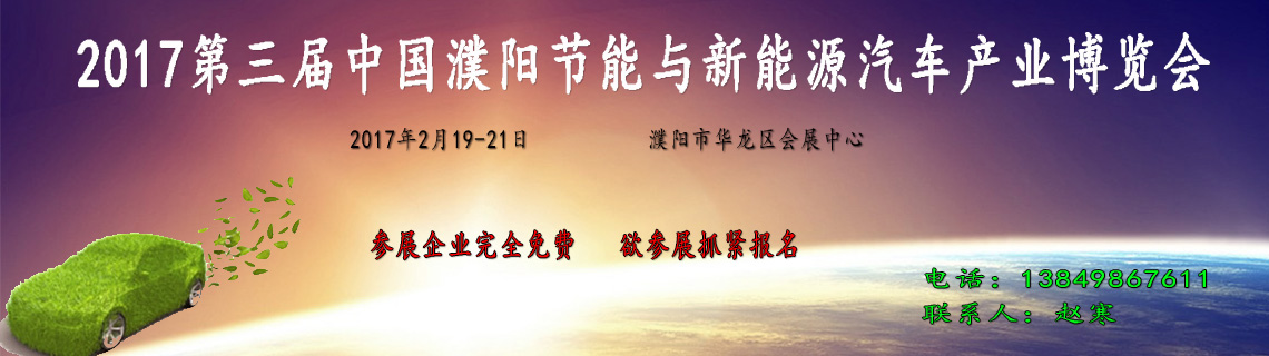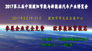 2017第三届中国濮阳节能与新能源汽车产业博览会(免费)2017年2月19日至21日在濮阳华龙区会展中心举办。